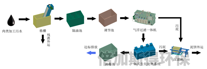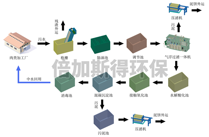 肉类加工污水来自屠宰车间生产过程外排水、地面冲洗水以及其它厂房地坪冲洗、烫毛、剖解、副食加工、洗油等。污水属于易于生物降解的高悬浮物有机废水,其水质、水量变化范围较大。污水中主要含有血液、油脂、碎肉、骨渣、毛及粪便等,污水呈褐红色,有机悬浮物含量高,易腐败,排入水体会消耗水中的溶解氧,破坏生态系统,污染环境。