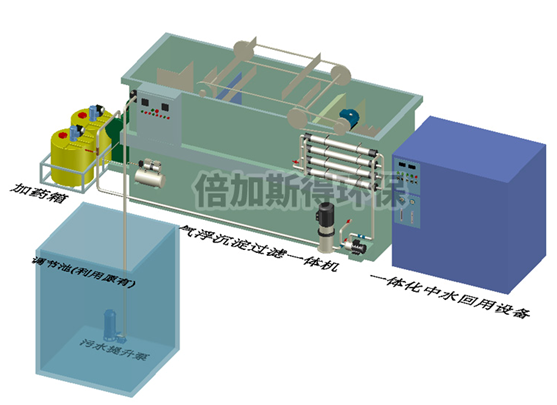 气浮机配备刮泥机,向气浮机里添加絮凝剂,形成的悬浮固体、油脂等污染物在溶气水的携带下上浮到水面,由刮泥机去除,气浮机的出水再进入一体化中水回用设备进一步去除油脂等污染物,达到洗车废水循环回用标准。